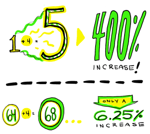 There is also some variation in how relative changes are reported. Here we have a 400% increase which is also the same as saying five times as much. This becomes more confusing when a relative change is negative. Something that is five times as small is an 80% decrease from the original amount.